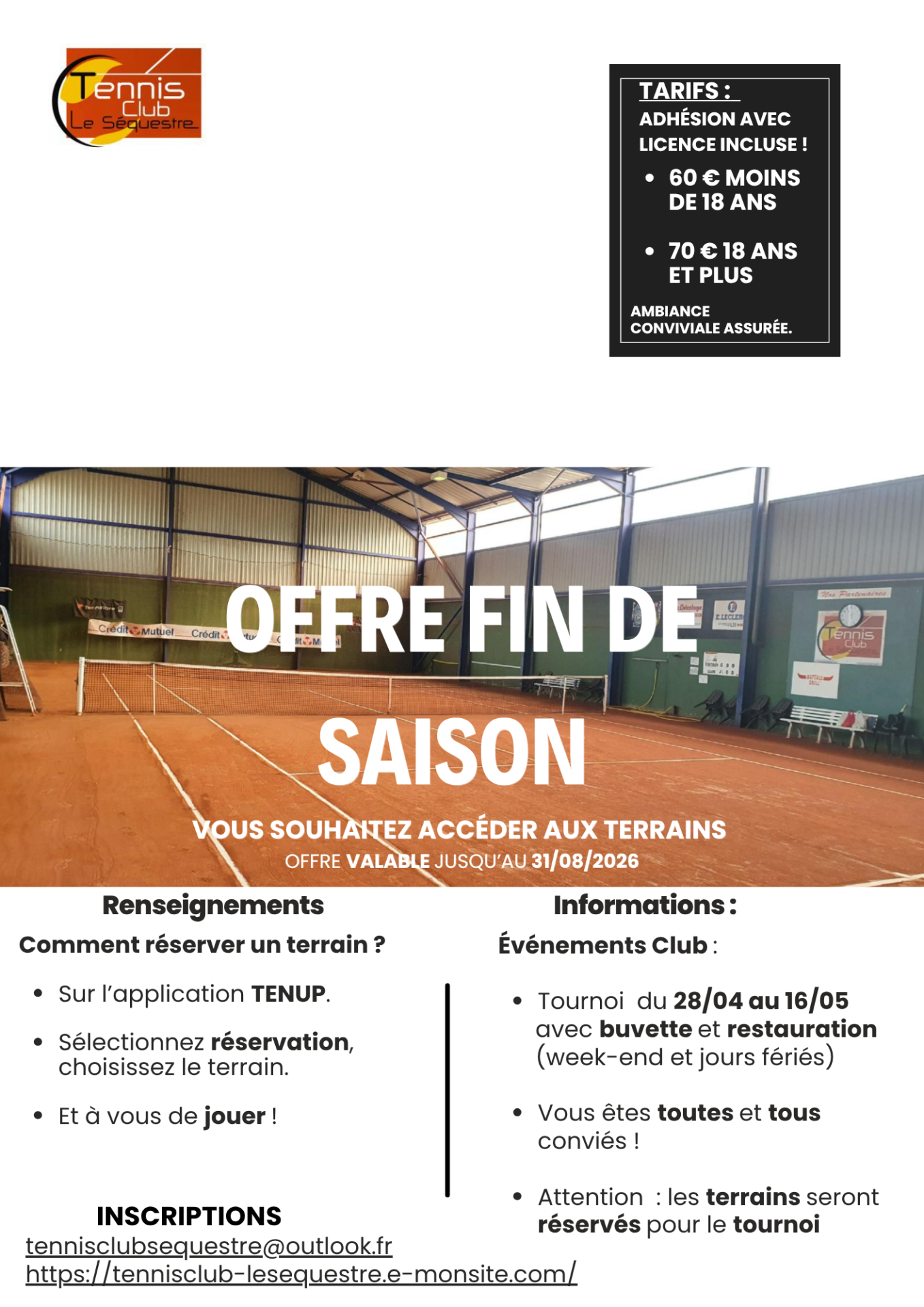 Veuillez bien prendre connaissance des documents liés à la pratique du tennis au Club du Séquestre, règlement intérieur, charte de bonne conduite, protocoles sanitaires, documents ci-dessous.